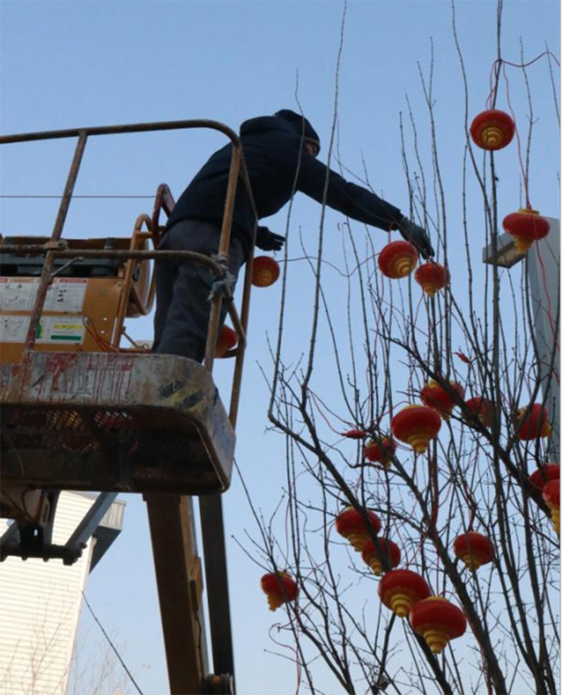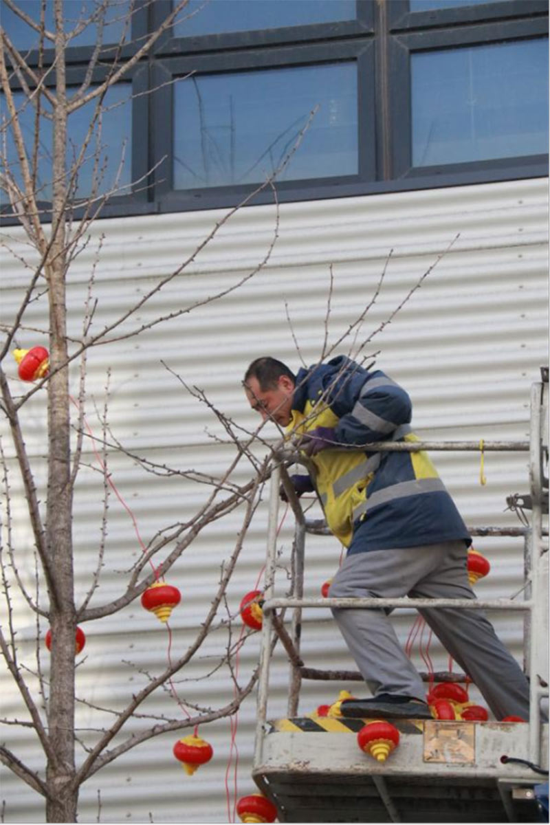 為給園區(qū)營(yíng)造濃厚的節(jié)日氣氛,給入駐企業(yè)帶來如家般的溫情呵護(hù),沈陽航發(fā)展運(yùn)營(yíng)管理有限公司物業(yè)團(tuán)隊(duì),在零下二十度的氣溫下,凍紅了雙手,冰覆了睫毛,但他們依然堅(jiān)守,扶梯的扶梯、攀爬的攀爬,將火紅的燈籠掛在園區(qū)主干道、企業(yè)門前。滿街的火紅,是他們對(duì)園區(qū)的熱愛,也是對(duì)工作的執(zhí)著,更是對(duì)崗位責(zé)任的滿滿執(zhí)念。園區(qū)的燈亮了,客戶們洋溢的笑臉,映襯著角落里一道道靚麗的風(fēng)景線,夜幕降臨下,五彩斑斕的彩色燈光給園區(qū)增添了不少喜慶的色彩,也深深的印在了師傅們熱切的心里。